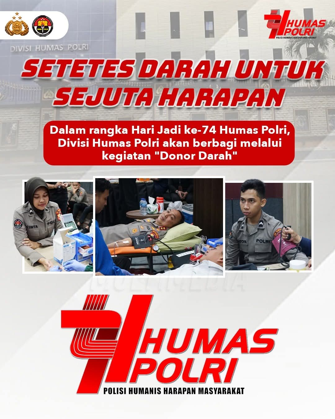 JAKARTA, MEDIAREALITA.COM – Dalam rangka memperingati Hari Jadi ke-74 Humas Polri, jajaran Humas Polri akan menyelenggarakan kegiatan Donor Darah.
