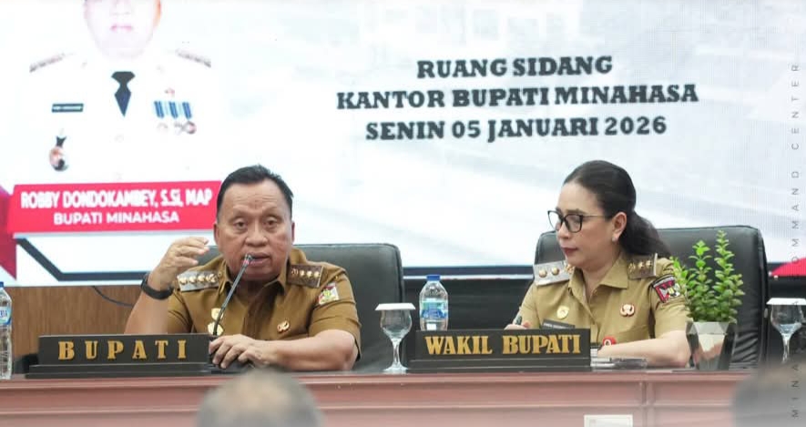 TONDANO, SR – Bupati Minahasa Robby Dondokambey, S.Si, MAP didampingi Wakil Bupati Minahasa Vanda Sarundajang, SS serta Sekretaris Daerah Kabupaten Minahasa Dr. Lynda D. Watania, MM, M.Si memimpin Rapat Kerja (Rakerda) Pemerintah Kabupaten Minahasa Tahun 2026,